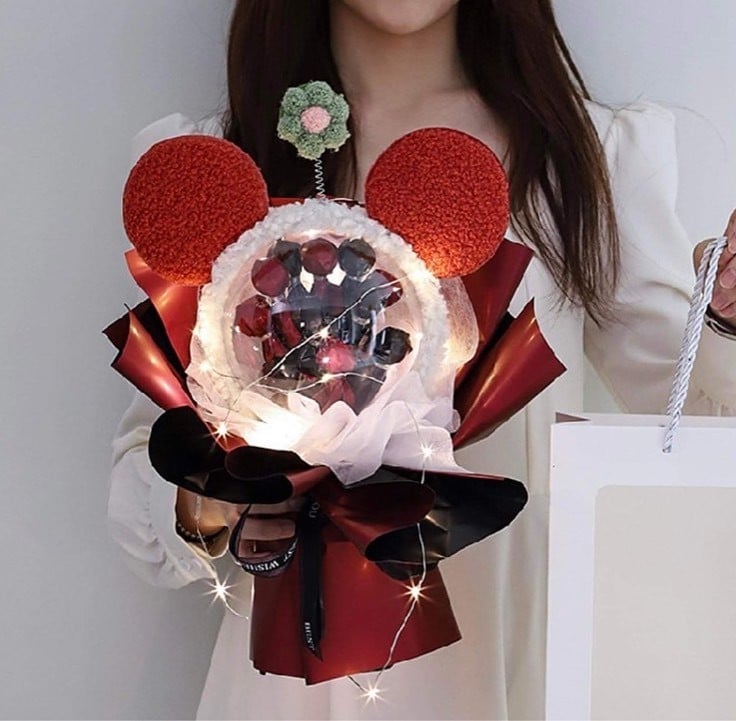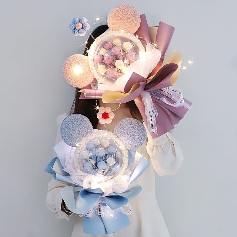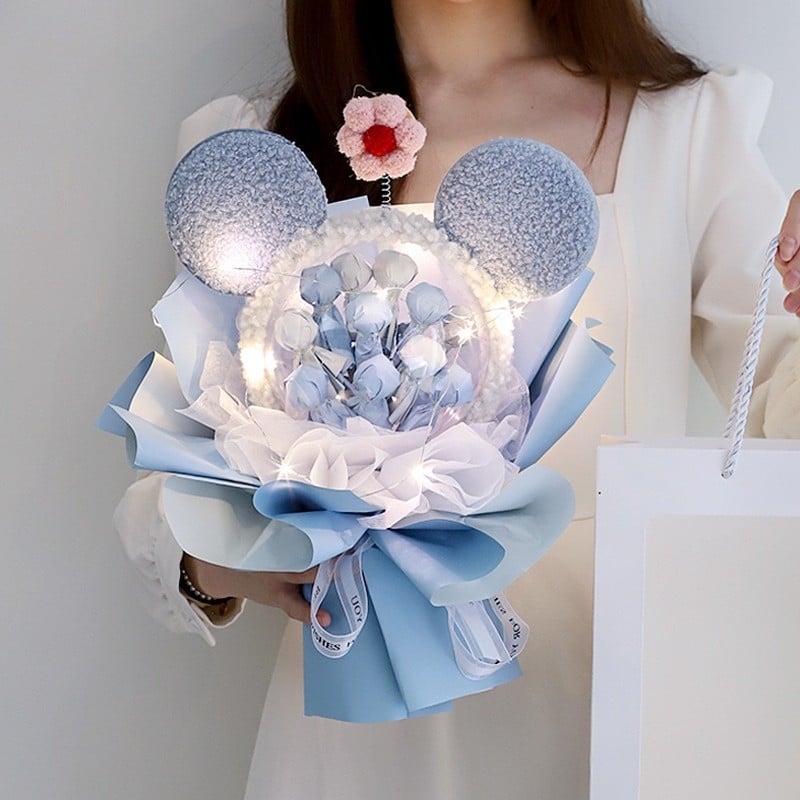 باقات بتصميم مبتكر مع مزينة بالأذنين الدائريتين يمكن فصلها و ارتداءها و مزينة بإضاءة LED ناعمة وألوان متناغمة، يمكن إضافة كرت مع عبارات تهنئة، لهدية تبقى في الذاكرة.